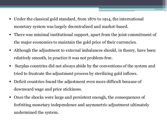 International gold standard provides the gold standard countries an international medium of exchange and standard of value. People are worried about the value of paper money. The gold standard makes chronic deficit spending by governments more difficult, as it prevents governments from 'inflating away' the real value of their debts. The reason is that the money supply can only grow at a rate proportional to the increase in gold supply. The most acclaimed advantages of international gold standard are: It can operate automatically without interference from the monetary authority. The gold standard reduced the risk of. The most important feature of the gold standard is that it is an automatic standard. The government sets the prices of the gold, and the citizens can exchange their paper money in gold because gold was in the trend at that time. The return of the gold standard came with advantages and disadvantages for distinct groups of people. The gold standard was a standard price set by the government to control the money supply in the country. To provide true assessment of causality rcts need to be conducted appropriately (i.e. Here are some of them: